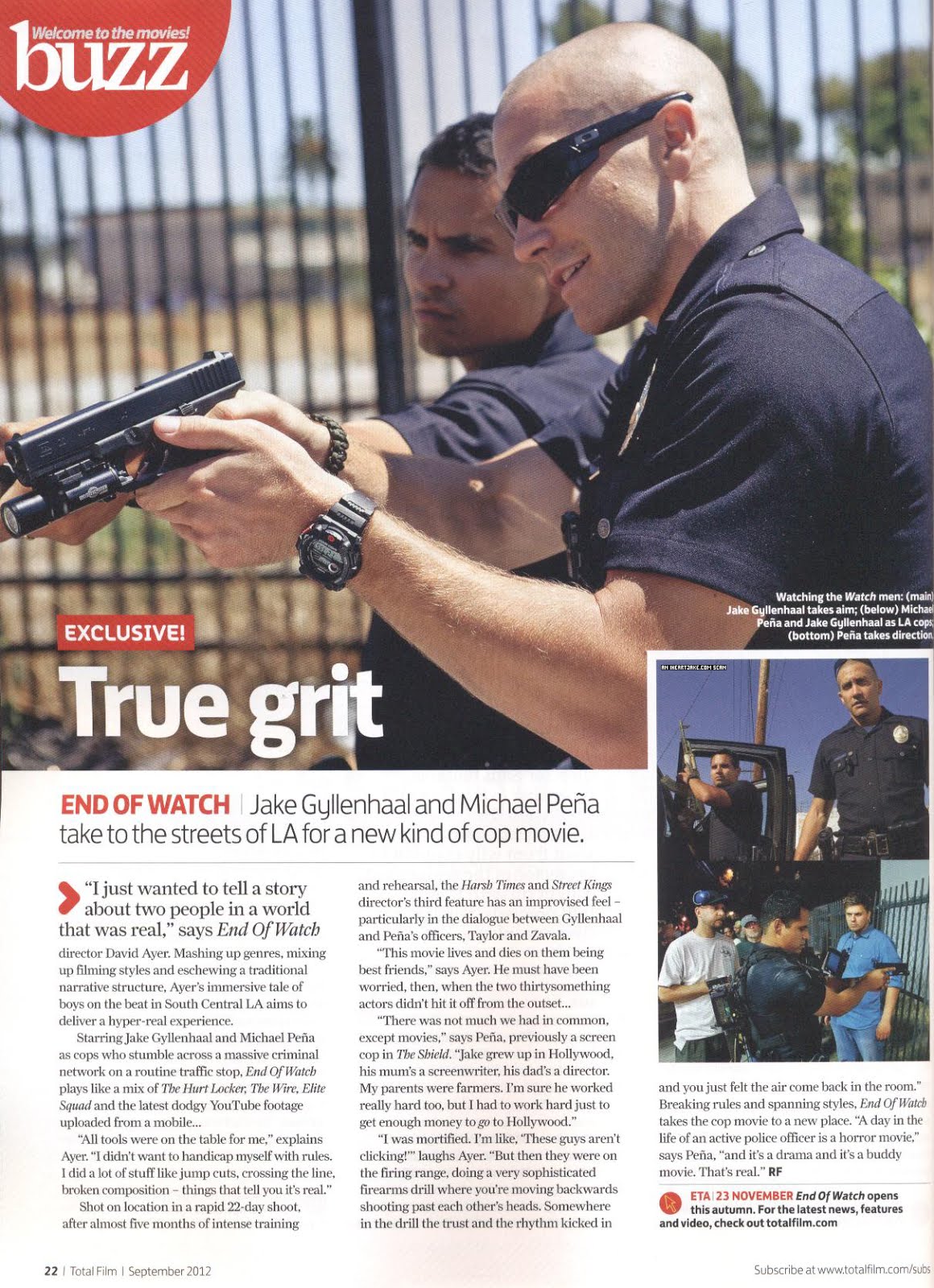 Scan of Jake Gyllenhaal and Michael Peña in "End of Watch", Total Film UK, December 2012